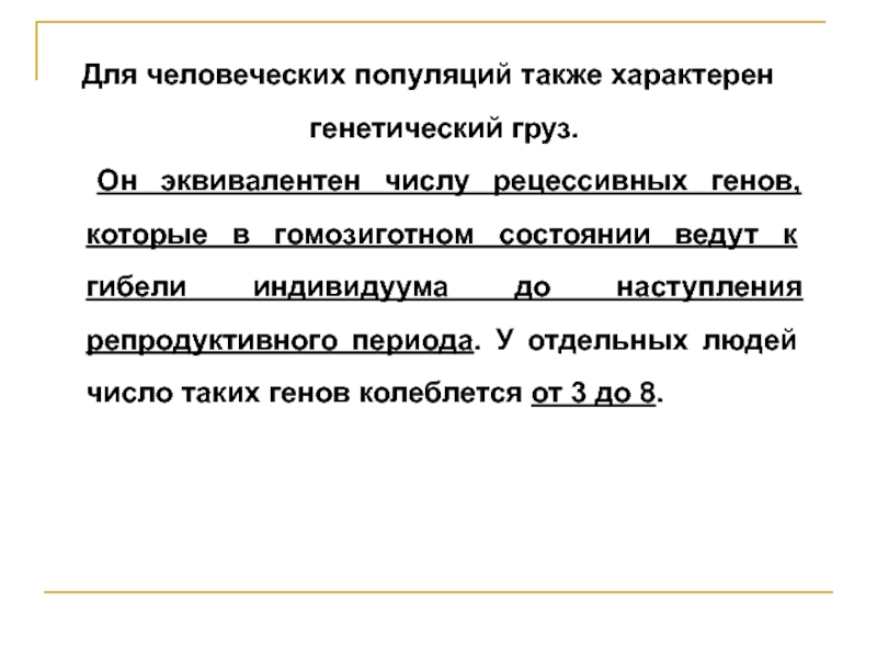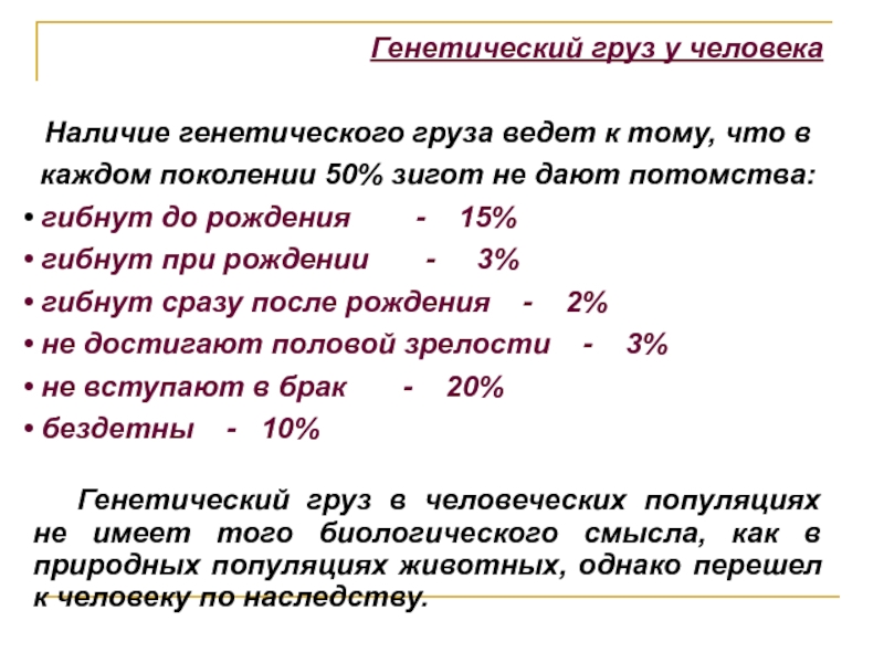 Генетический груз в человеческих популяциях не имеет того биологического смысла, как в природных популяциях животных, однако перешел к человеку по наследству.