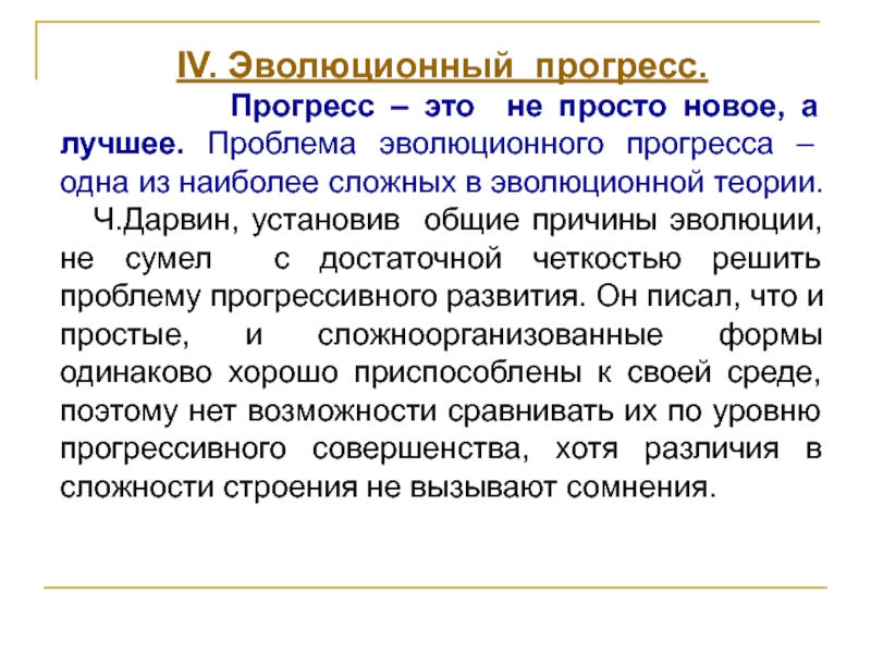 Ч.Дарвин, установив общие причины эволюции, не сумел с достаточной четкостью решить проблему прогрессивного развития. Он писал, что и простые, и сложноорганизованные формы одинаково хорошо приспособлены к своей среде, поэтому нет возможности сравнивать их по уровню прогрессивного совершенства, хотя различия в сложности строения не вызывают сомнения.