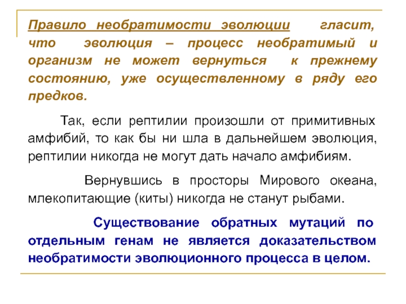 Так, если рептилии произошли от примитивных амфибий, то как бы ни шла в дальнейшем эволюция, рептилии никогда не могут дать начало амфибиям.