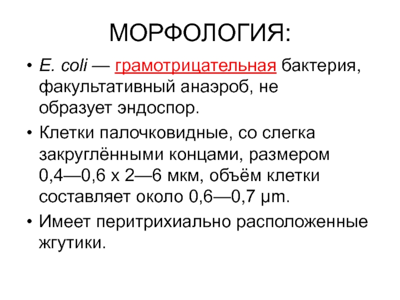 E. coli — грамотрицательная бактерия, факультативный анаэроб, не образует эндоспор.