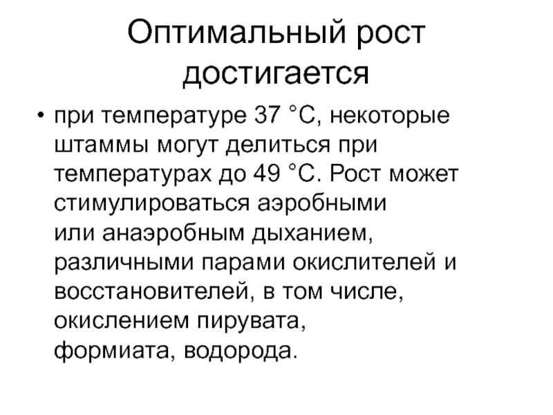 температурах до 49 °C. Рост может стимулироваться аэробными или анаэробным дыханием, различными
