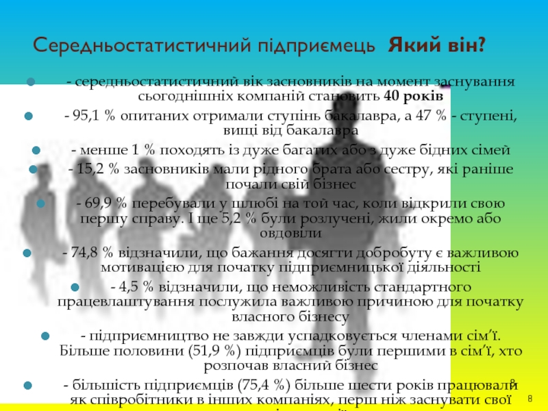 - 15,2 % засновників мали рідного брата або сестру, які раніше почали свій бізнес