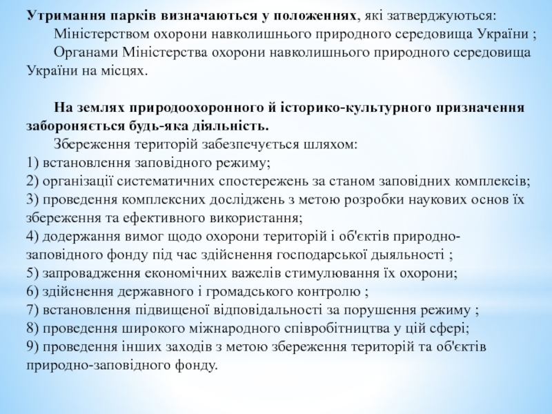 Слайд 7Утримання парків визначаються у положеннях, які затверджуються: