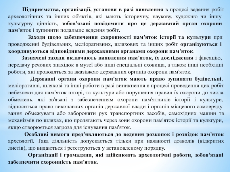 Закон передбачає спеціальні заходи щодо забезпечення збереження пам'яток історії та культури при будівельних та інших роботах.