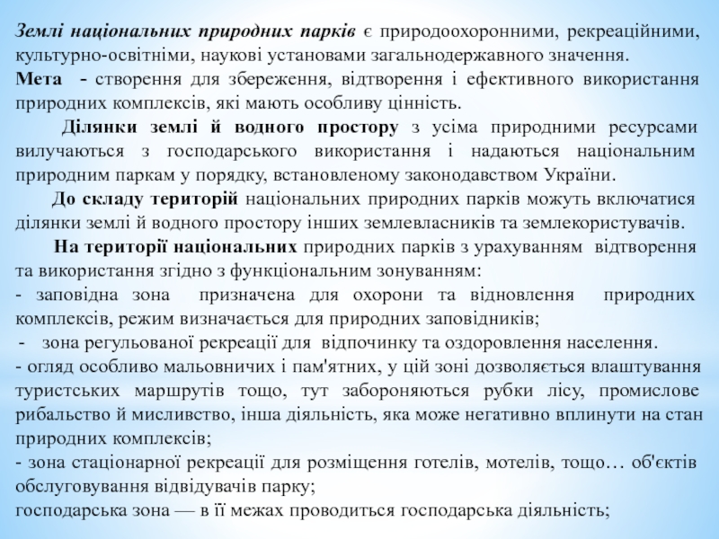 Слайд 11Землі національних природних парків є природоохоронними, рекреаційними, культурно-освітніми, наукові установами