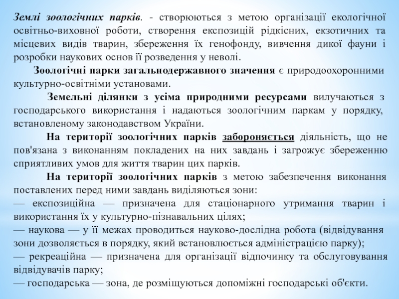 На території зоологічних парків забороняється діяльність, що не пов'язана з виконанням покладених на них завдань і загрожує збереженню сприятливих умов для життя тварин цих парків.