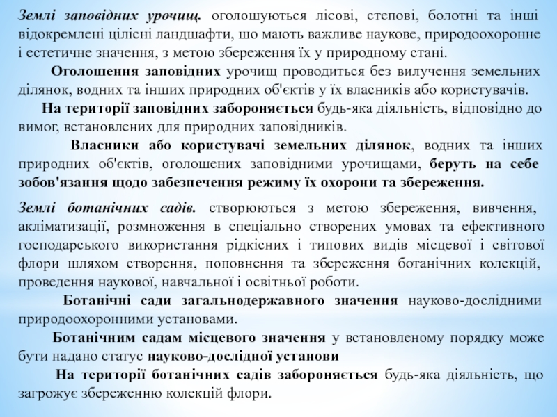 Слайд 15Землі заповідних урочищ. оголошуються лісові, степові, болотні та інші відокремлені
