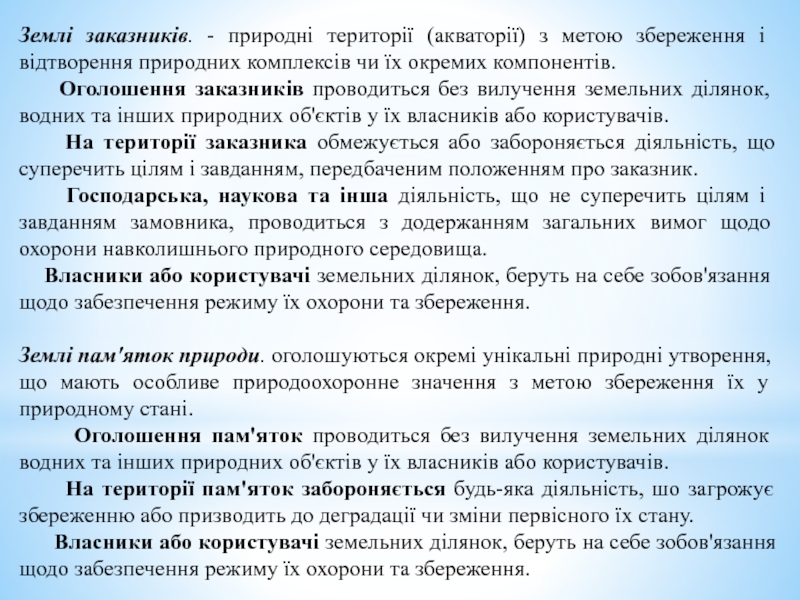 Слайд 12Землі заказників. - природні території (акваторії) з метою збереження і