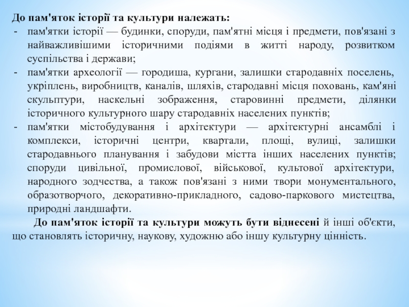 пам'ятки містобудування і архітектури — архітектурні ансамблі і комплекси, історичні центри, квартали, площі, вулиці, залишки стародавнього планування і забудови містта інших населених пунктів; споруди цивільної, промислової, військової, культової архітектури, народного зодчества, а також пов'язані з ними твори монументального, образотворчого, декоративно-прикладного, садово-паркового мистецтва, природні ландшафти.