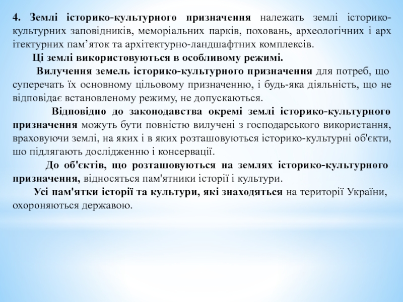 Слайд 304. Землі історико-культурного призначення належать землі історико-культурних заповідників, меморіальних парків,