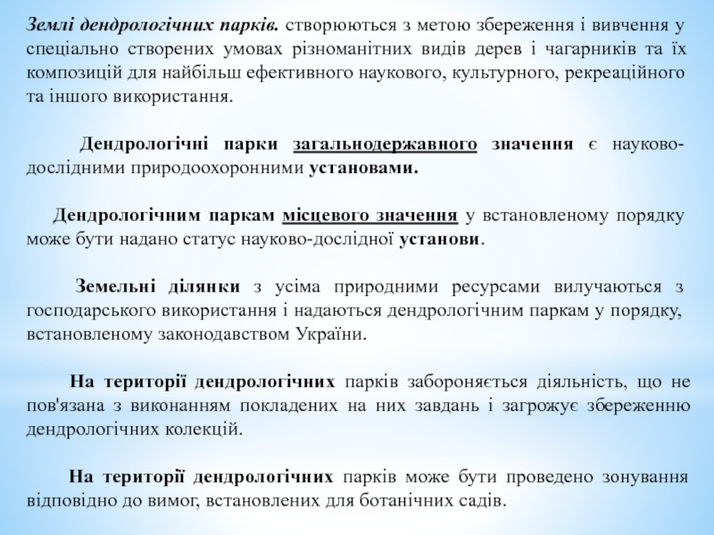 Слайд 16Землі дендрологічних парків. створюються з метою збереження і вивчення у