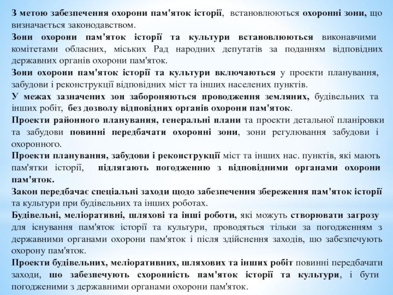 Слайд 36З метою забезпечення охорони пам'яток історії, встановлюються охоронні зони, що
