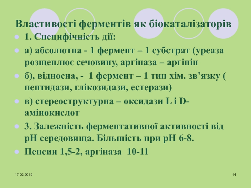 - 1 фермент – 1 тип хім. зв’язку ( пептидази, глікозидази, естерази)