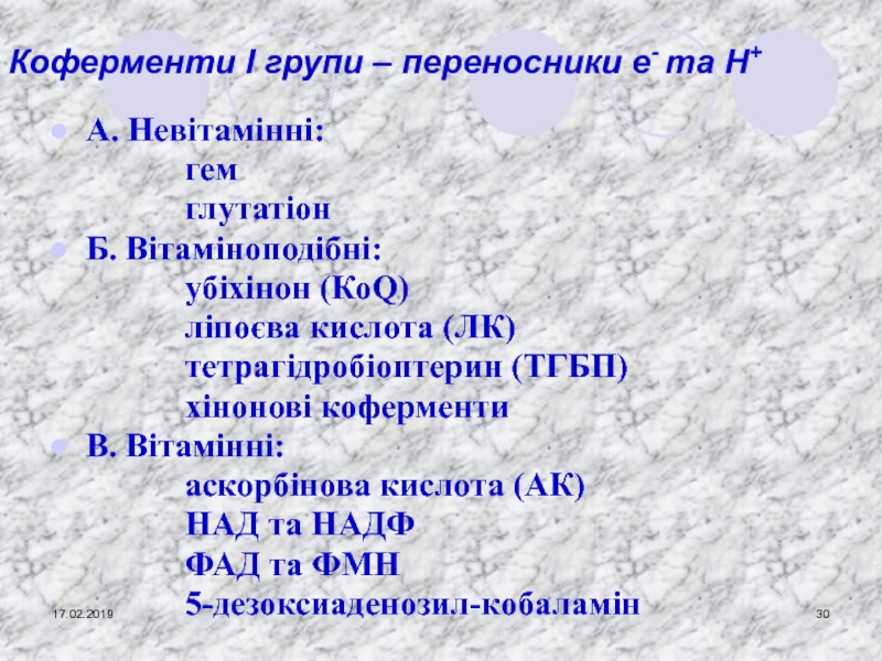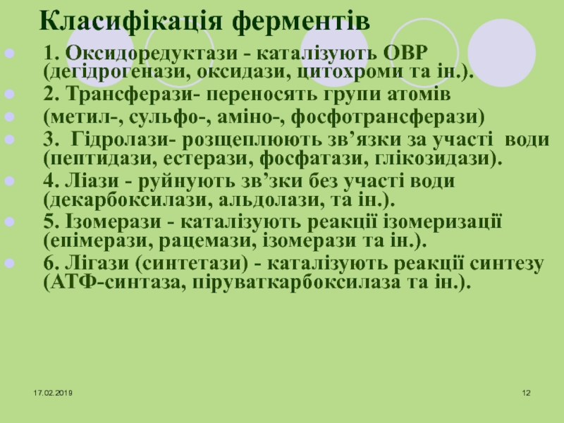 1. Оксидоредуктази - каталізують ОВР (дегідрогенази, оксидази, цитохроми та