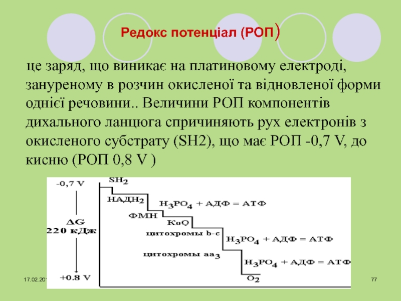 компонентів дихального ланцюга спричиняють рух електронів з окисленого субстрату (SН2), що має РОП -0,7 V, до кисню (РОП 0,8 V )