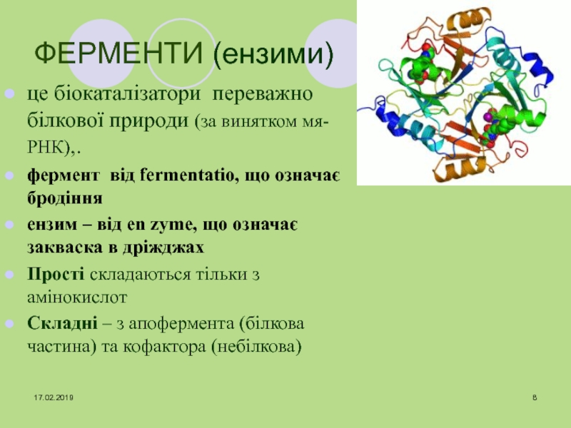 Складні – з апофермента (білкова частина) та кофактора (небілкова)