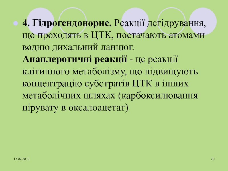 Слайд 704. Гідрогендонорне. Реакції дегідрування, що проходять в ЦТК, постачають атомами