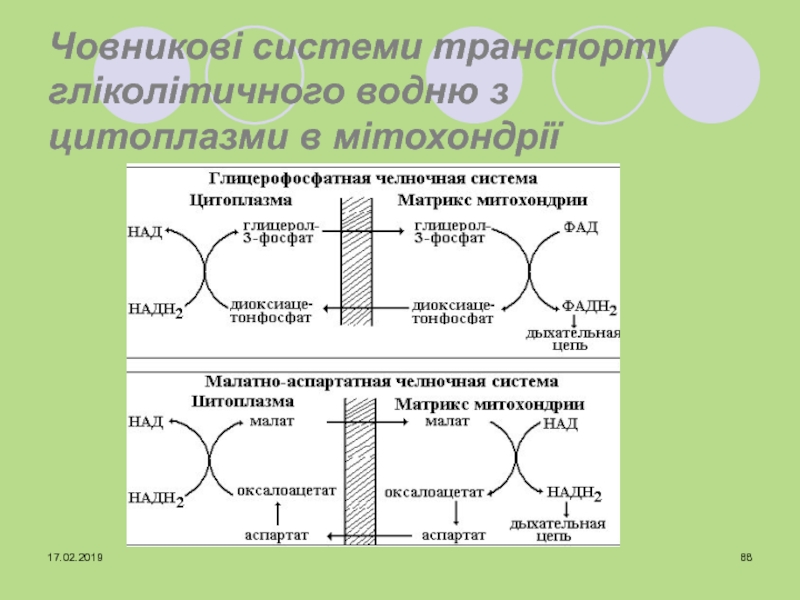 Слайд 88Човникові системи транспорту гліколітичного водню з цитоплазми в мітохондрії
