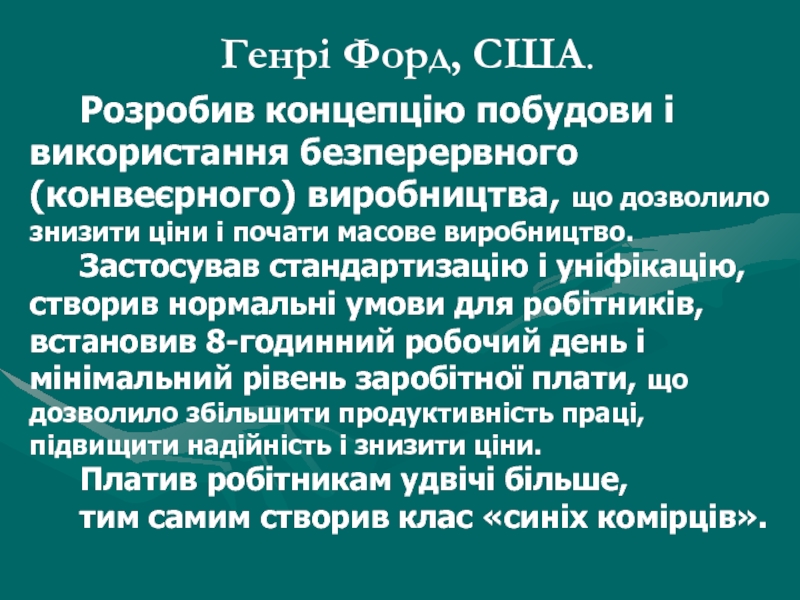 і уніфікацію, створив нормальні умови для робітників, встановив 8-годинний робочий день і мінімальний рівень заробітної плати, що дозволило збільшити продуктивність праці, підвищити надійність і знизити ціни.