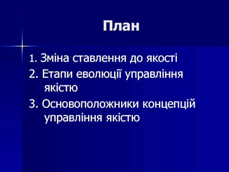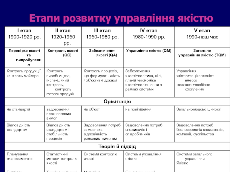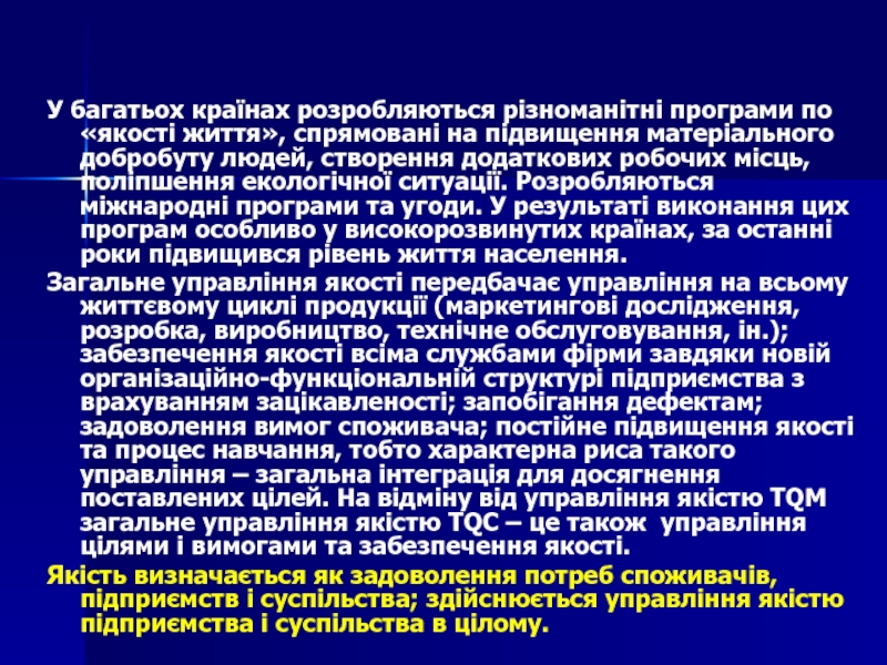 Якість визначається як задоволення потреб споживачів, підприємств і суспільства; здійснюється управління якістю підприємства і суспільства в цілому.