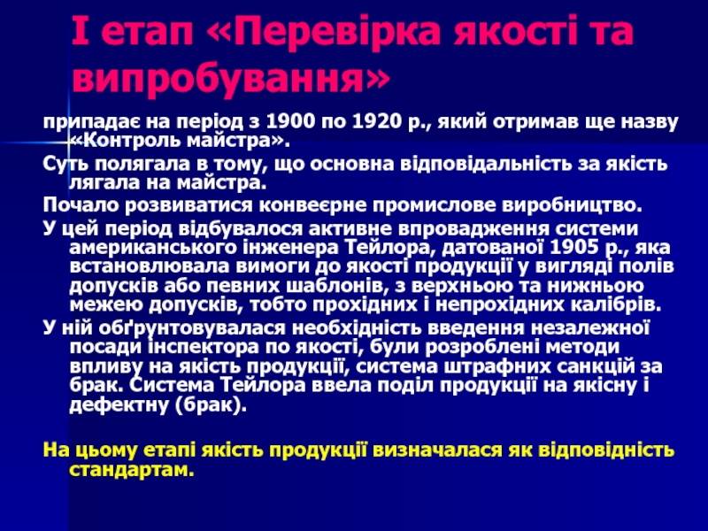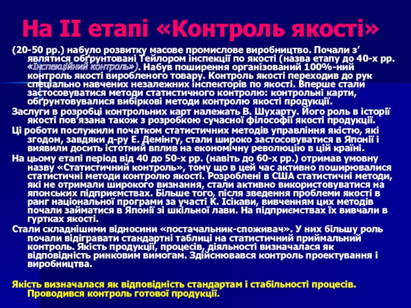 етапу до 40-х рр. «Інспекційний контроль»). Набув поширення організований 100%-ний контроль якості виробленого товару. Контроль якості переходив до рук спеціально навчених незалежних інспекторів по якості. Вперше стали застосовуватися методи статистичного контролю: контрольні карти, обґрунтовувалися вибіркові методи контролю якості продукції.