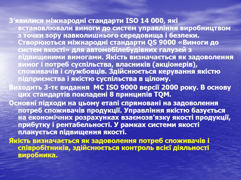 відбувається подальше вдосконалення міжнародних стандартів, посилення впливу суспільства на розвиток виробничих процесів і охорону навколишнього середовища.