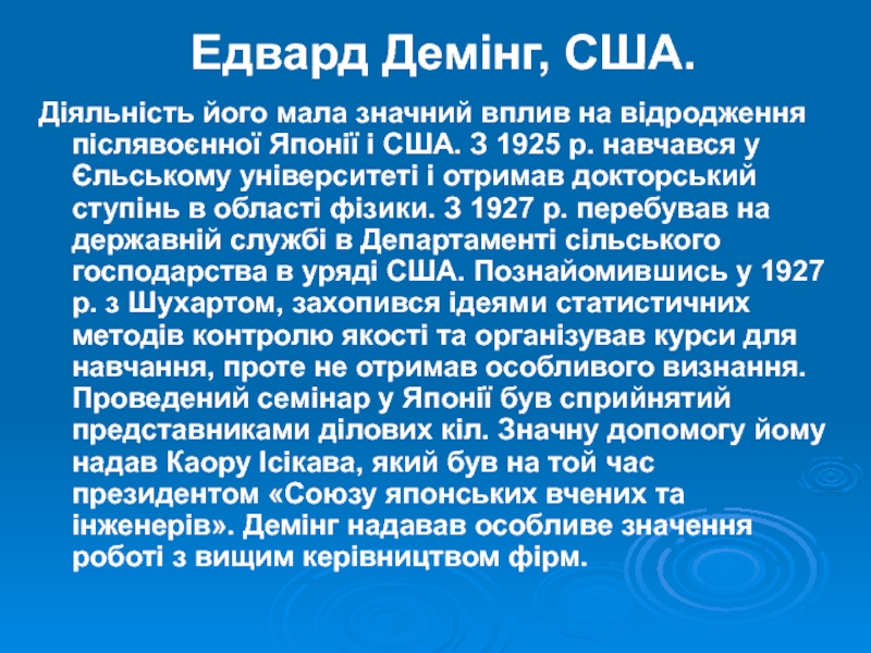 Сформулював 14 принципів, що визначають послідовність дій щодо забезпечення якості на підприємствах.