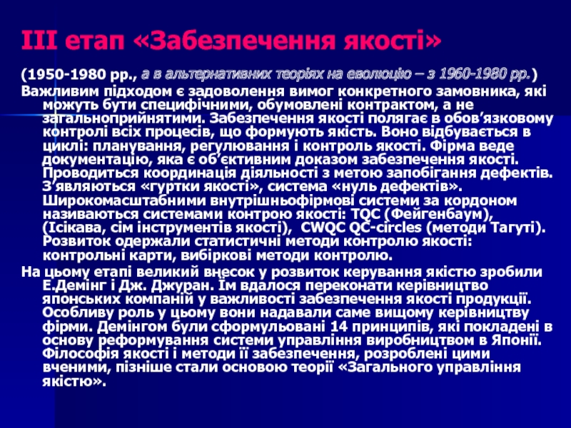 На цьому етапі великий внесок у розвиток керування якістю зробили Е.Демінг і Дж. Джуран. Їм вдалося переконати керівництво японських компаній у важливості забезпечення якості продукції. Особливу роль у цьому вони надавали саме вищому керівництву фірми. Демінгом були сформульовані 14 принципів, які покладені в основу реформування системи управління виробництвом в Японії. Філософія якості і методи її забезпечення, розроблені цими вченими, пізніше стали основою теорії «Загального управління якістю».