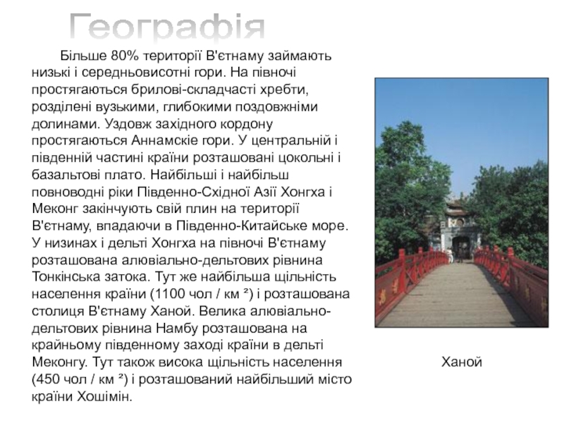 західного кордону простягаються Аннамскіе гори. У центральній і південній частині країни розташовані цокольні і базальтові плато. Найбільші і найбільш повноводні ріки Південно-Східної Азії Хонгха і Меконг закінчують свій плин на території В'єтнаму, впадаючи в Південно-Китайське море. У низинах і дельті Хонгха на півночі В'єтнаму розташована алювіально-дельтових рівнина Тонкінська затока. Тут же найбільша щільність населення країни (1100 чол / км ²) і розташована столиця В'єтнаму Ханой. Велика алювіально-дельтових рівнина Намбу розташована на крайньому південному заході країни в дельті Меконгу. Тут також висока щільність населення (450 чол / км ²) і розташований найбільший місто країни Хошімін.