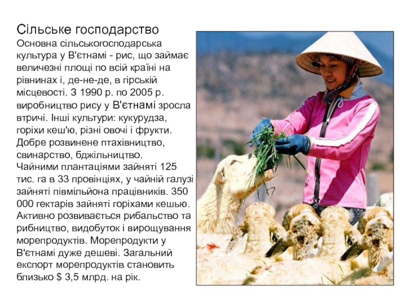 гірській місцевості. З 1990 р. по 2005 р. виробництво рису у В'єтнамі зросла втричі. Інші культури: кукурудза, горіхи кеш'ю, різні овочі і фрукти. Добре розвинене птахівництво, свинарство, бджільництво.