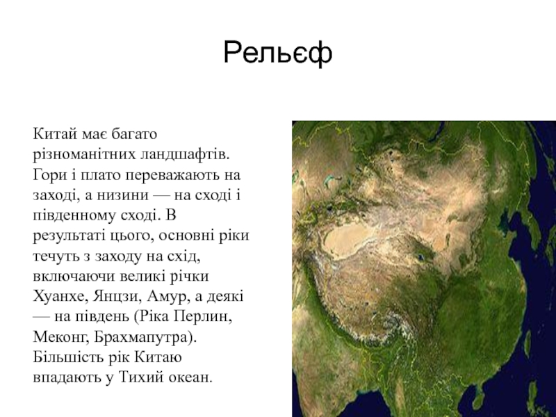 Рельєф: 2/3 займають гори та пустелі (на півночі і заході), включно з пустелею Гобі на півночі, на сході рівнина зрошується річкамиХуанхе (кит. Жовта ріка), Янцзи і Сіцзян.