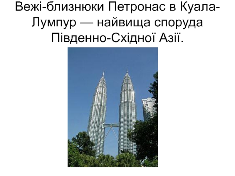 Слайд 143Вежі-близнюки Петронас в Куала-Лумпур — найвища споруда Південно-Східної Азії.