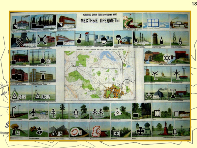Условные знаки местных предметов по их назначению и свойствам подразделяются на четыре вида: масштабные, внемасштабные, линейные и пояснительные.