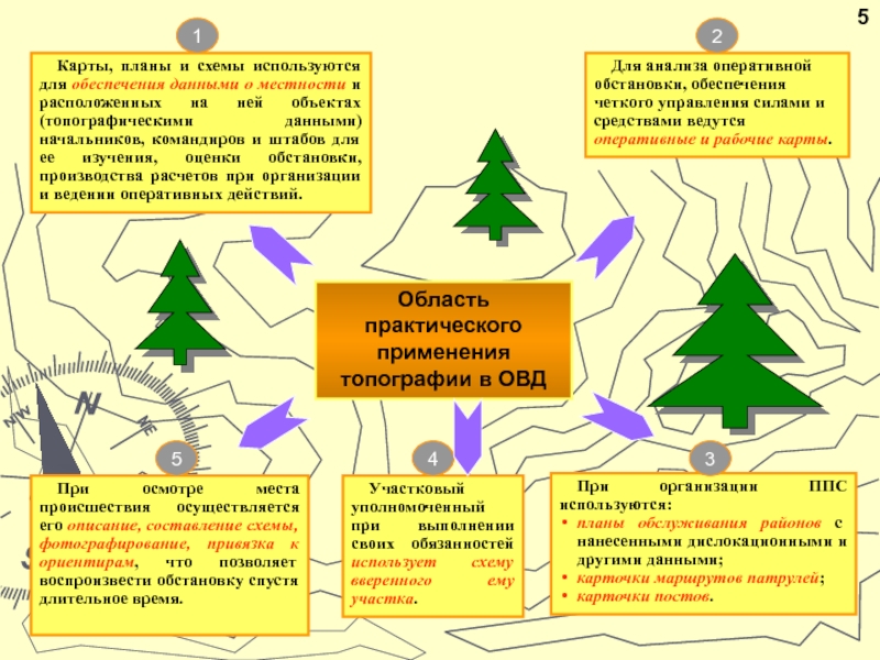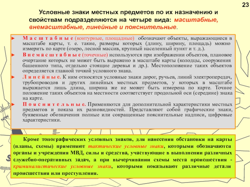 Кроме топографических условных знаков, для нанесения обстановки на карты (планы, схемы) применяют тактические условные знаки, которыми обозначаются органы и учреждения МВД, силы и средства, участвующие в выполнении различных служебно-оперативных задач, а при вычерчивании схемы места происшествия - криминалистические условные знаки, которыми показывают различные детали происшествия или преступления.