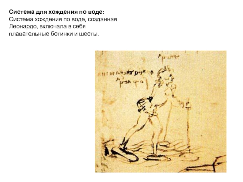 на поверхность, подтверждает рисунок слева: "Если хочешь остаться на поверхности, надуй козлиную шкуру, потяни за подвешенный снизу груз и иди". Леонардо, несомненно, знал гидростатику. Он мог быть вдохновлен подводной лодкой Цезариано, которая была построена и опробована во рву, окружавшем замок в Милане. Возможно, судно Леонардо да Винчи погружалось, используя систему грузов и балластов; всплывало на поверхность путем нагнетания воздуха в специальные отсеки, встроенные в обшивку корабля. Накачка воздуха на суше производилась парусами, а под водой - веслами.