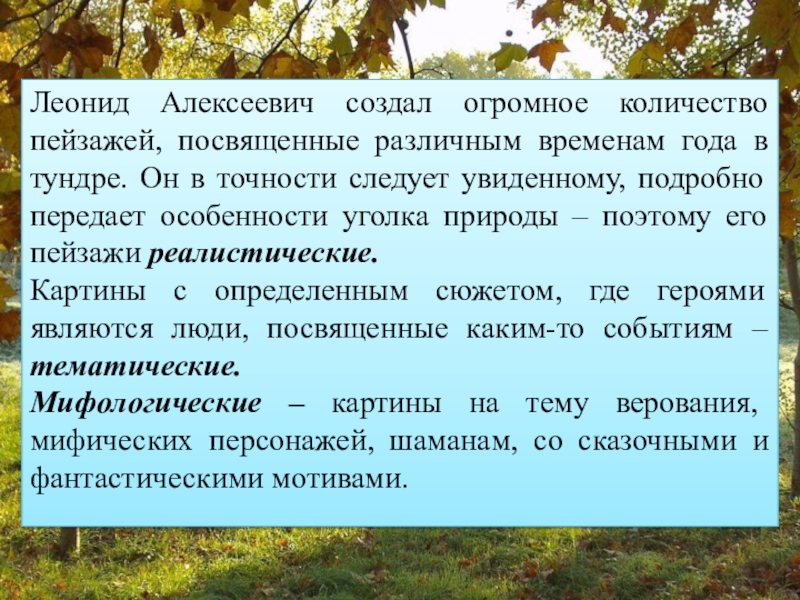 Слайд 5Леонид Алексеевич создал огромное количество пейзажей, посвященные различным временам года