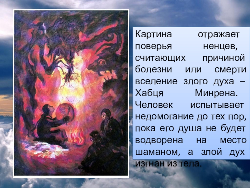 Слайд 12Картина отражает поверья ненцев, считающих причиной болезни или смерти вселение
