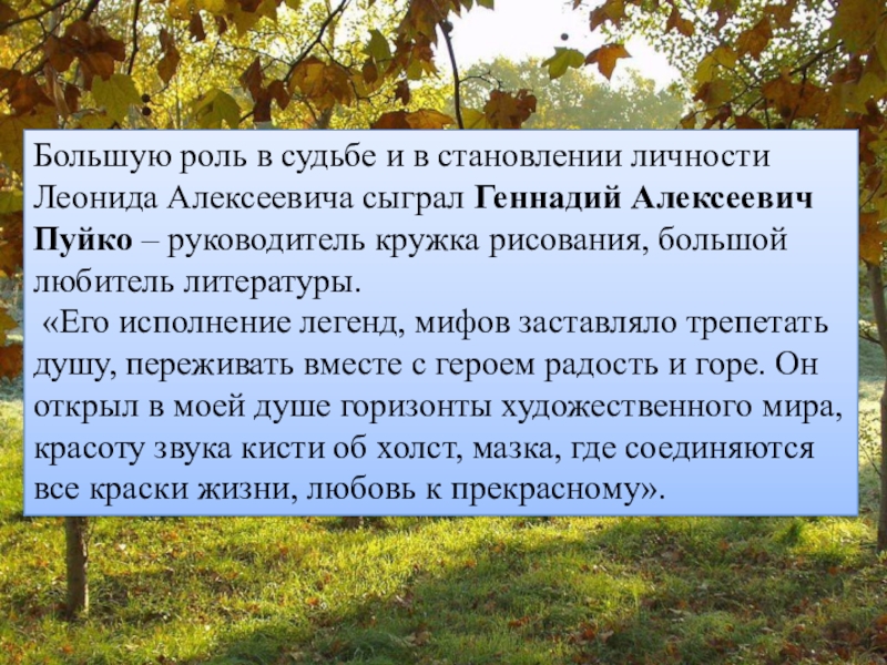 Слайд 4Большую роль в судьбе и в становлении личности Леонида Алексеевича