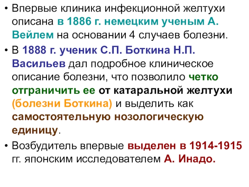 Слайд 2Впервые клиника инфекционной желтухи описана в 1886 г. немецким ученым