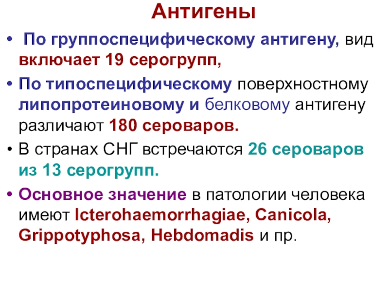 Основное значение в патологии человека имеют Icterohaemorrhagiae, Canicola, Grippotyphosa, Hebdomadis и пр.