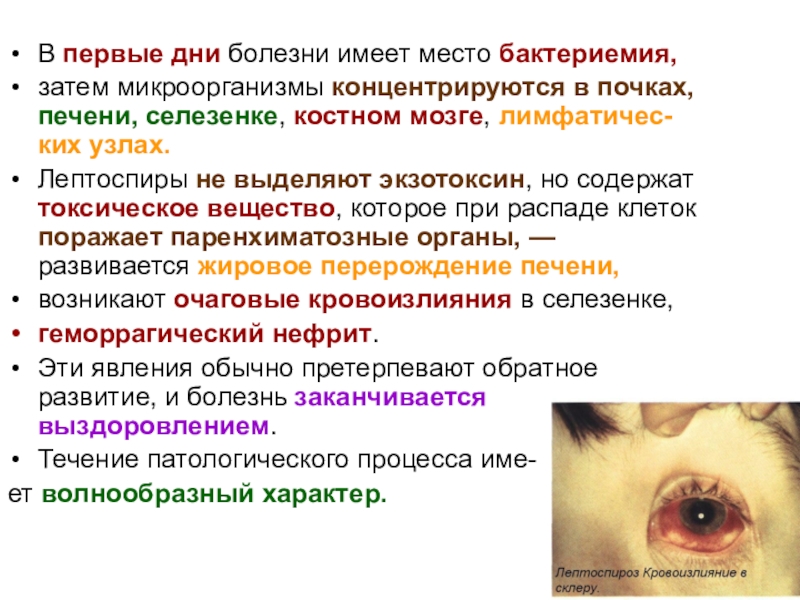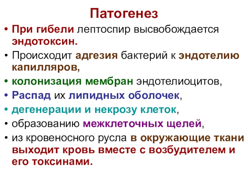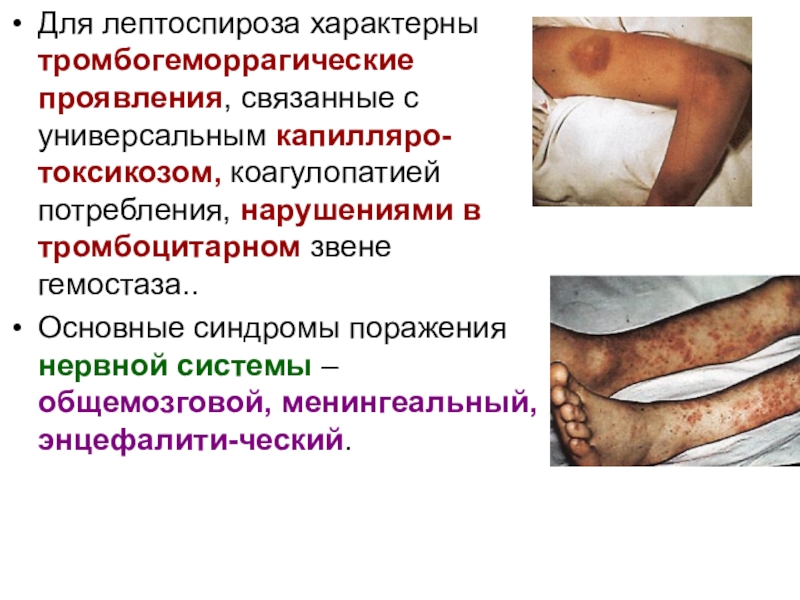 Слайд 20Для лептоспироза характерны тромбогеморрагические проявления, связанные с универсальным капилляро-токсикозом, коагулопатией