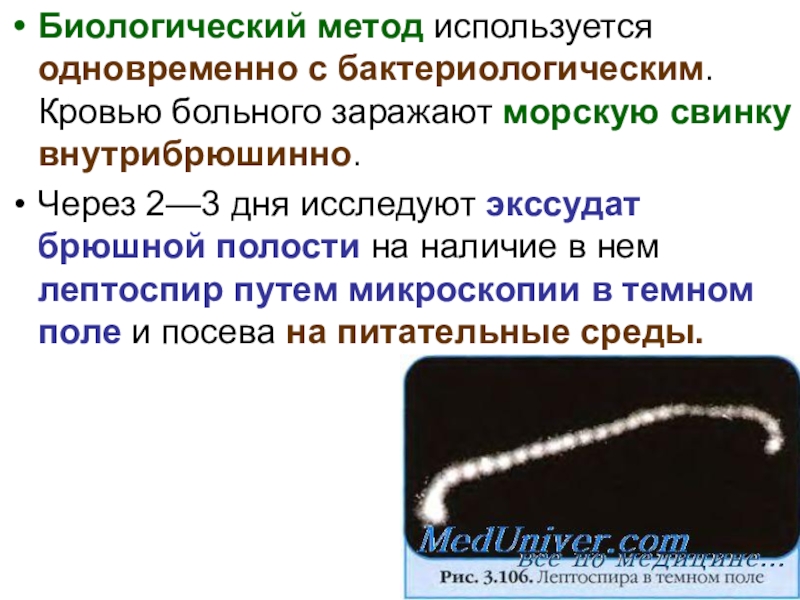 Слайд 27Биологический метод используется одновременно с бактериологическим. Кровью больного заражают морскую