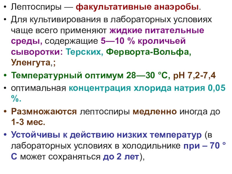 Слайд 8Лептоспиры — факультативные анаэробы.
