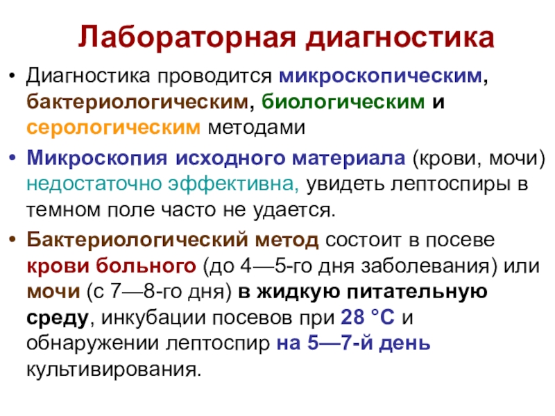 Бактериологический метод состоит в посеве крови больного (до 4—5-го дня заболевания) или мочи (с 7—8-го дня) в жидкую питательную среду, инкубации посевов при 28 °С и обнаружении лептоспир на 5—7-й день культивирования.