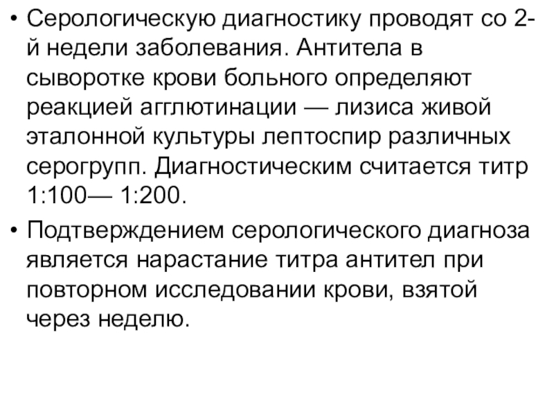 лептоспир различных серогрупп. Диагностическим считается титр 1:100— 1:200.