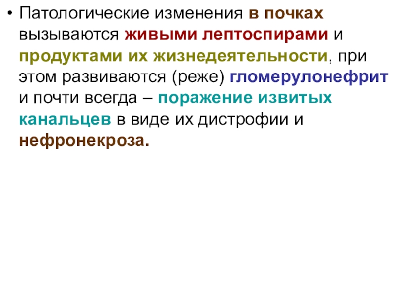 Слайд 21Патологические изменения в почках вызываются живыми лептоспирами и продуктами их