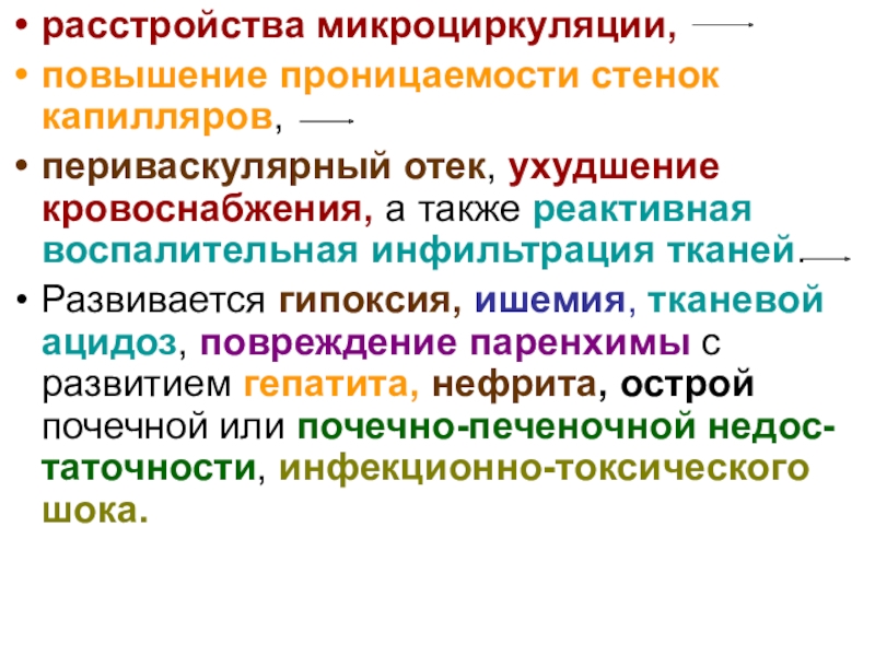 повреждение паренхимы с развитием гепатита, нефрита, острой почечной или почечно-печеночной недос-таточности, инфекционно-токсического шока.