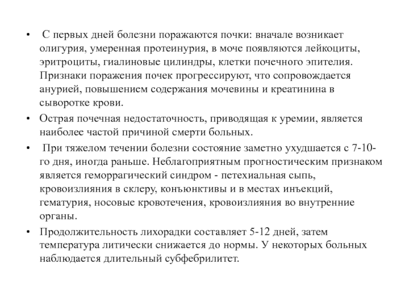 Слайд 21 С первых дней болезни поражаются почки: вначале возникает олигурия,