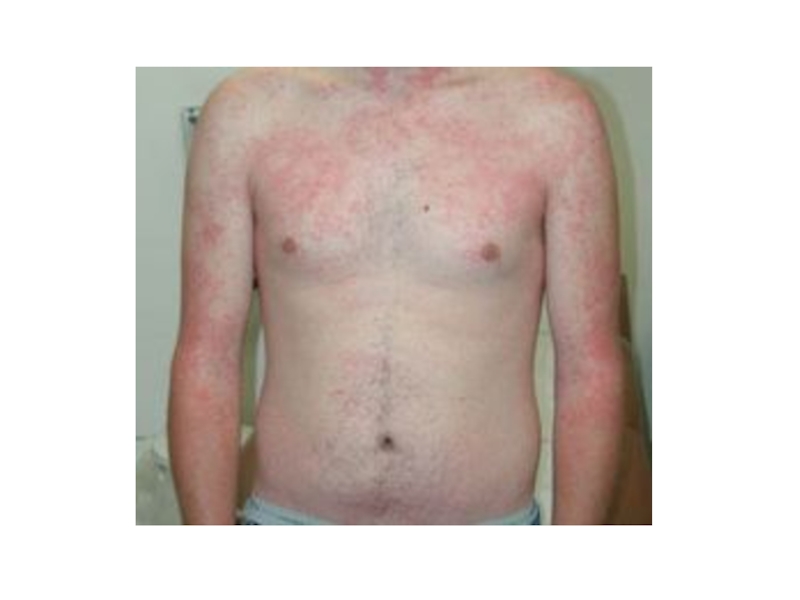У части пациентов на 3-5-й день болезни отмечается розеолезно-папулезная или эритематозная, реже петехиальная сыпь, расположенная симметрично на коже конечностей и туловища.