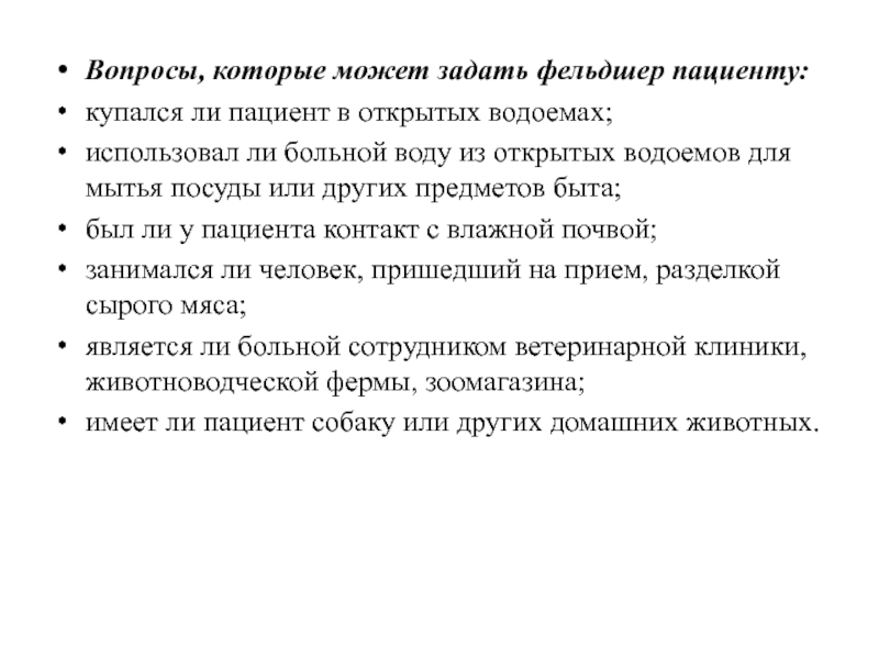 и эпидемиологических данных (профессиональный фактор: работники мясоперерабатывающей промышленности, животноводческих ферм, лица, соприкасающиеся по роду своей деятельности с синантропными грызунами, пребывание в эндемичном очаге - охота, рыбалка, купание и употребление воды из открытых водоемов, контакт с больными животными или носителями - собаками, ондатрами, нутриями и т. д.).